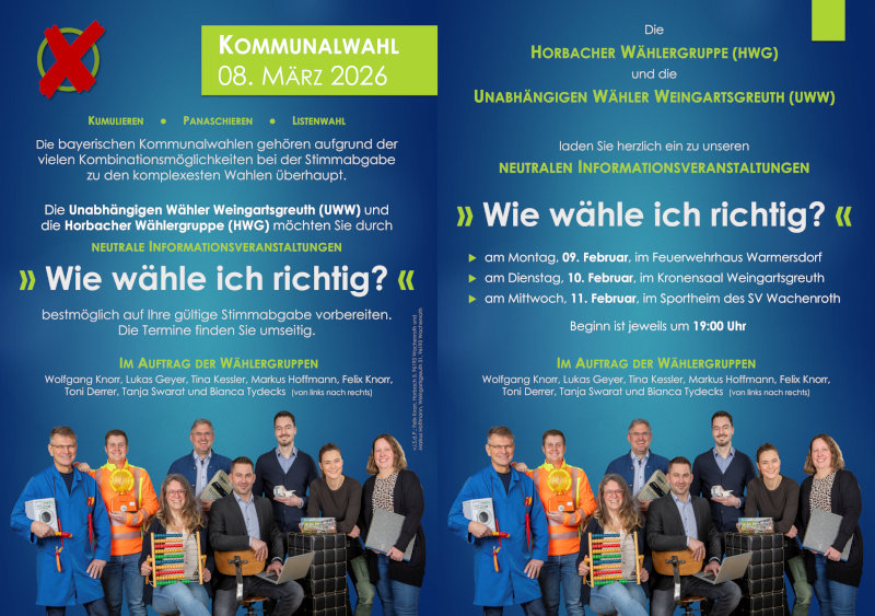 Der drei neutralen Infoabende der beiden Wählergruppen HWG und UWW fanden am 09., 10. und 11. Februar 2026 im Warmersdorfer Feuerwehrhaus, im Kronensaal in Weingartsgreuth sowie im Sportheim des SV Wachenroth statt. Felix Knorr von der HWG erklärte den Besuchern anhand einer Präsentation mit vielen neutral gestalteten Musterlisten die zahlreichen Kombinationsmöglichkeiten bei der Stimmabgabe.